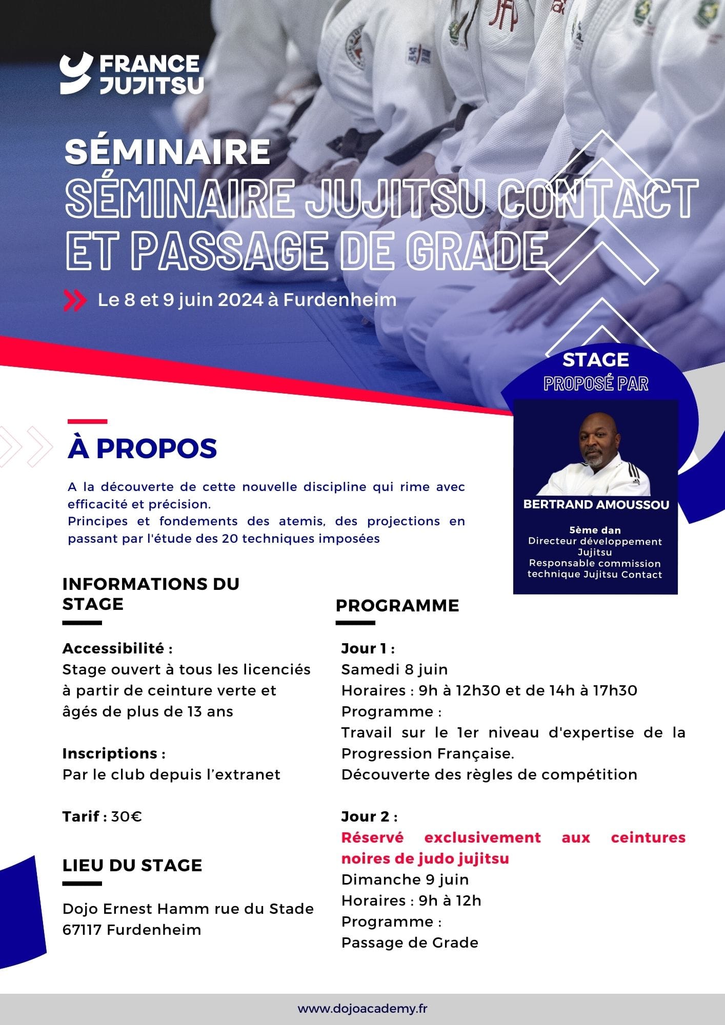 Un séminaire national de jujitsu contact animé par Bertrand AMOUSSOU se déroulera les 8 et 9 juin 2024 au Dojo Ernest Hamm de Furdenheim (67). Ne manquez pas l’opportunité d’explorer cette nouvelle discipline innovante alliant efficacité et précision. Venez nombreux!