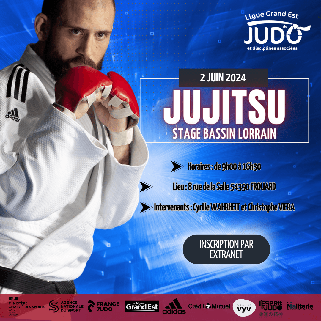 Que vous soyez novice ou confirmé, la ligue vous propose, après celui dans le bassin alsacien le 20 avril 2024, un stage de jujitsu dans le bassin lorrain, sous la houlette de Cyrille WAHRHEIT et Christohe VIERA, le 2 juin 2024 de 9h00 à 16h30 à Frouard (54). Profitez de cette excellente occasion de progresser dans une ambiance conviviale. Alors, venez nombreux, les inscriptions se font via extranet.