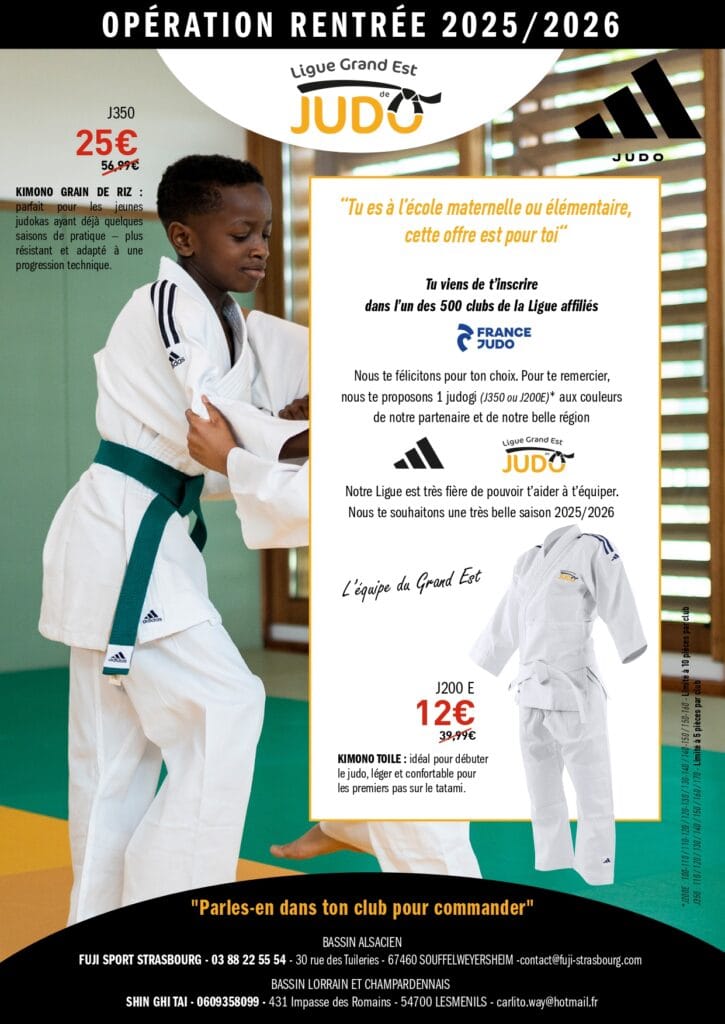En partenariat avec Adidas, ainsi que les prestataires Shin Ghi Taï Lorrain et Fuji Sport Strasbourg, la Ligue Grand Est s’engage à rendre la pratique du judo accessible à tous. Dans cette optique, nous avons le plaisir d’offrir à nos jeunes judokas la possibilité de s’équiper d’un judogi neuf, brodé aux couleurs de la ligue, à un prix exceptionnel !